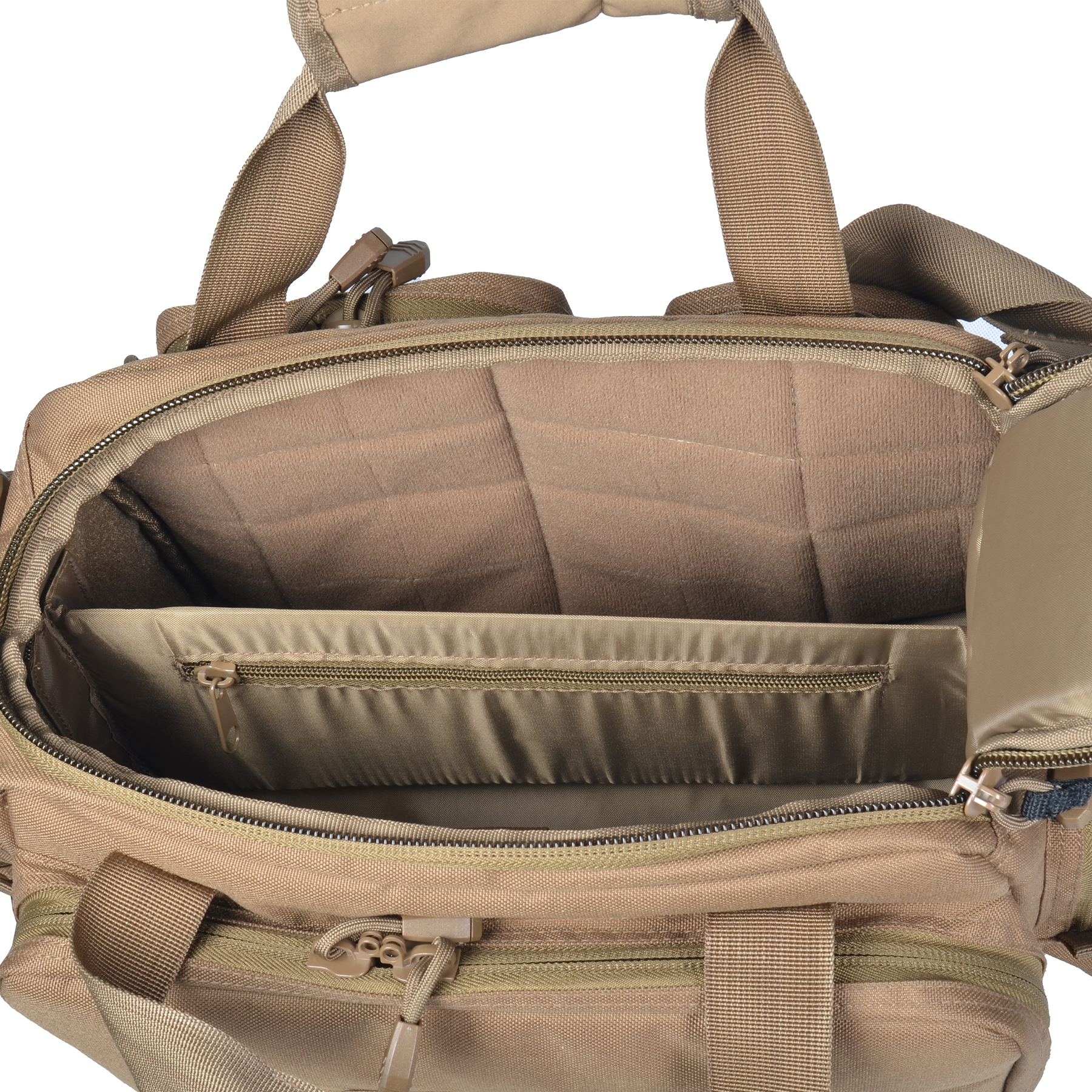 - Main compartment includes lockable zippers and soft hook and loop interior walls